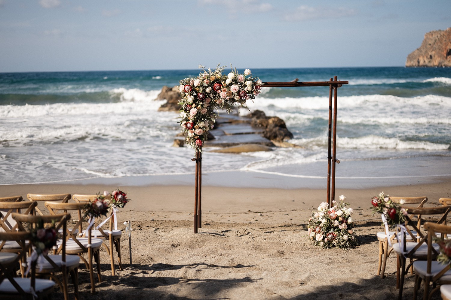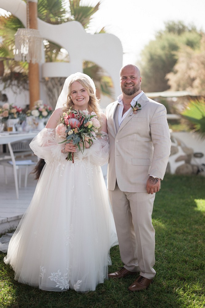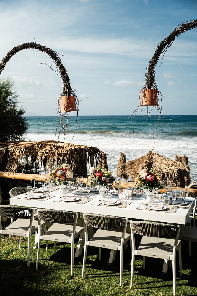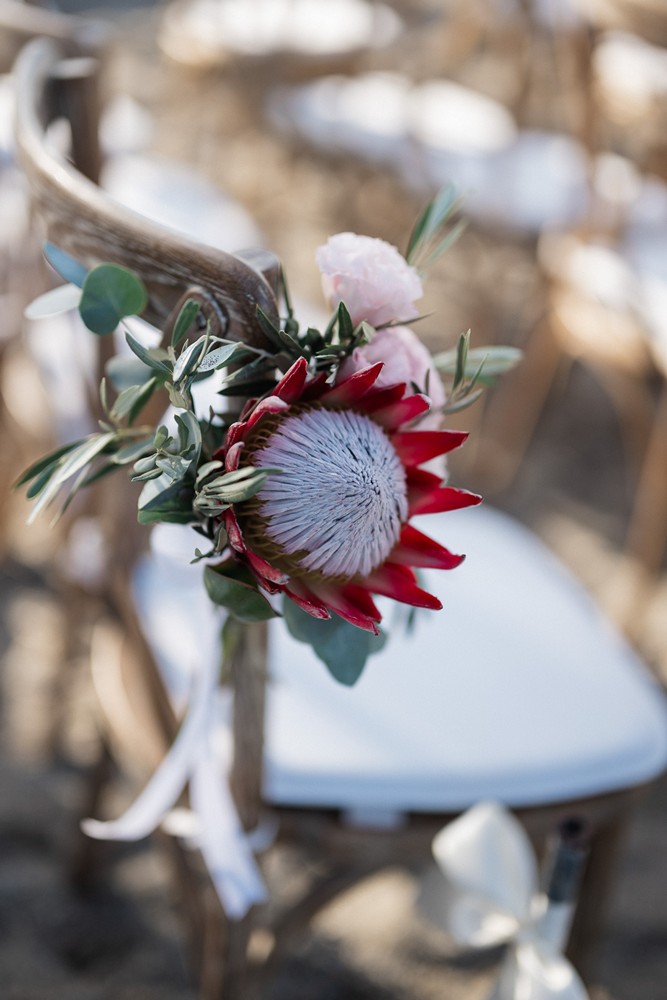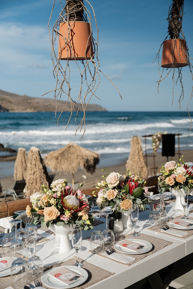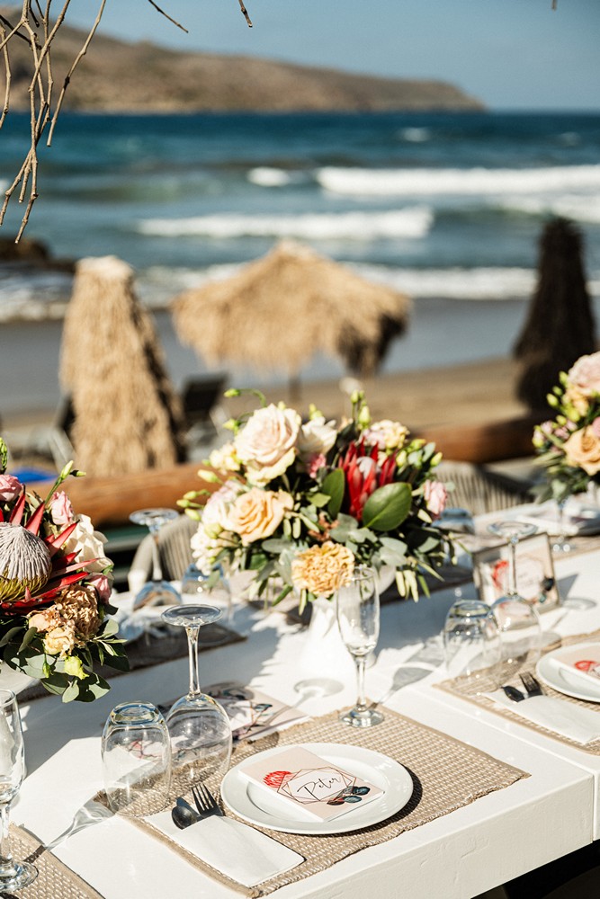 Surrounded by the natural beauty of Western Coast of Chania the couple brought together their unique cultural story—Norwegian roots blended with the bride’s South African heritage. This fusion was elegantly reflected in their choice of the protea flower, a striking and symbolic bloom that added an exotic touch to the celebration.